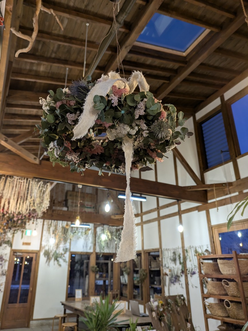 ゆらゆら揺れる、見上げて楽しむリースです。